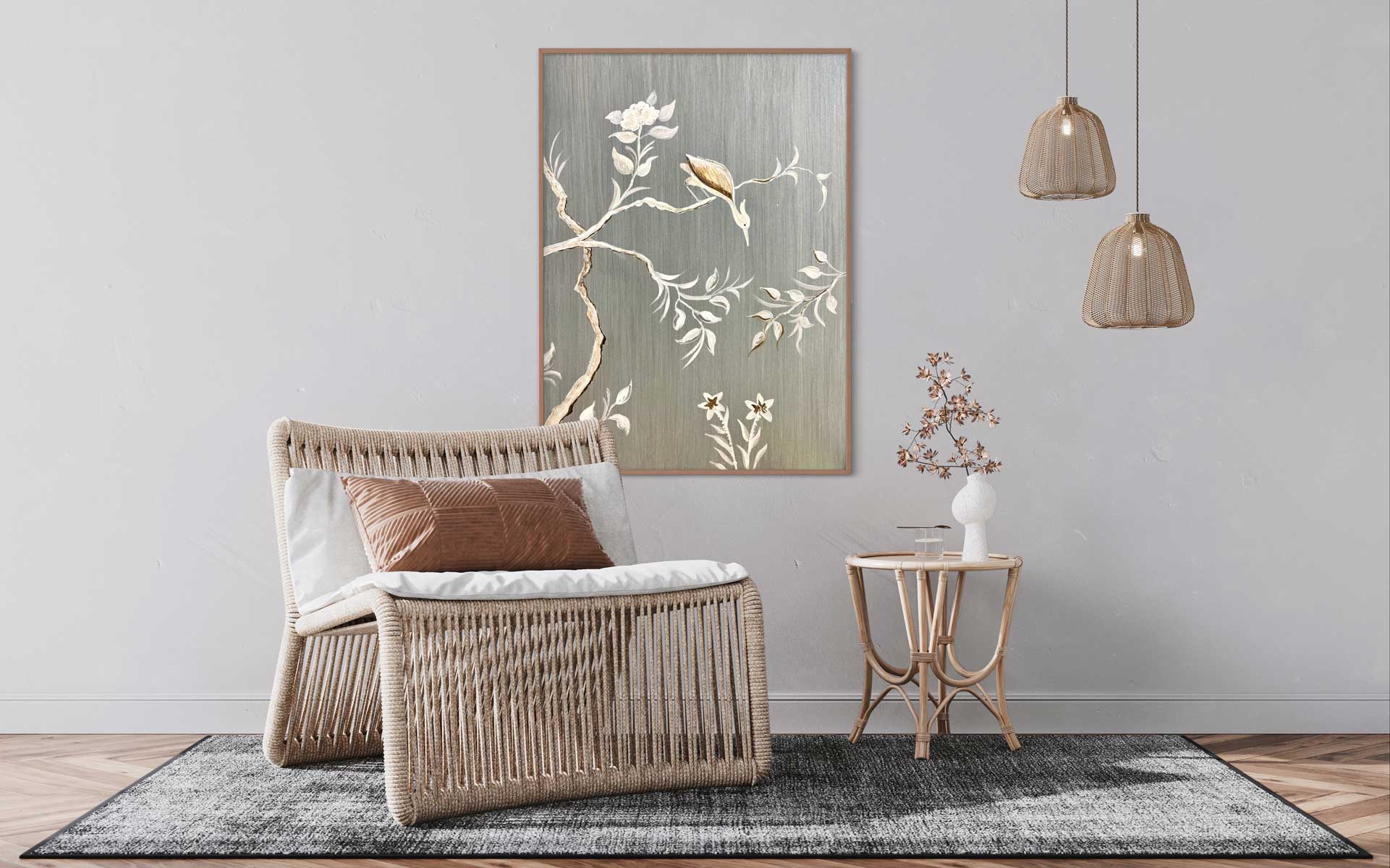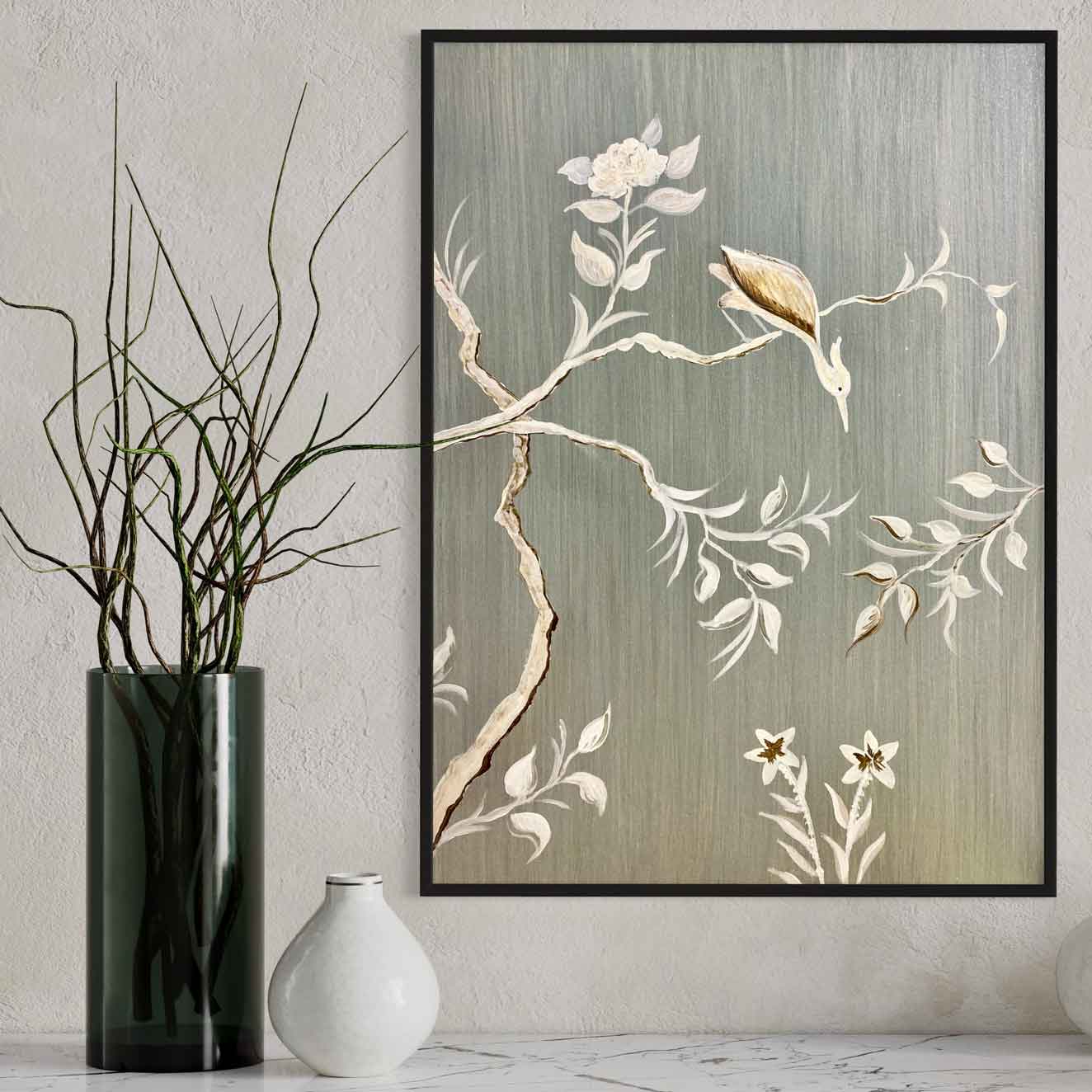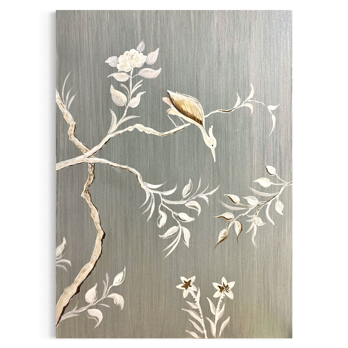 Ein zarter Kranich, dargestellt inmitten von Blumen und Zweigen: Dieses Bild mit seinem schimmernden metallischen Hintergrund vermittelt gleichzeitig ein Gefühl von Ruhe und Dynamik, Bewegung und Stille. Schon gewusst? Als einer der anmutigsten Vögel im Tierreich steht der Kranich für Glück, Gesundheit und ein langes Leben.