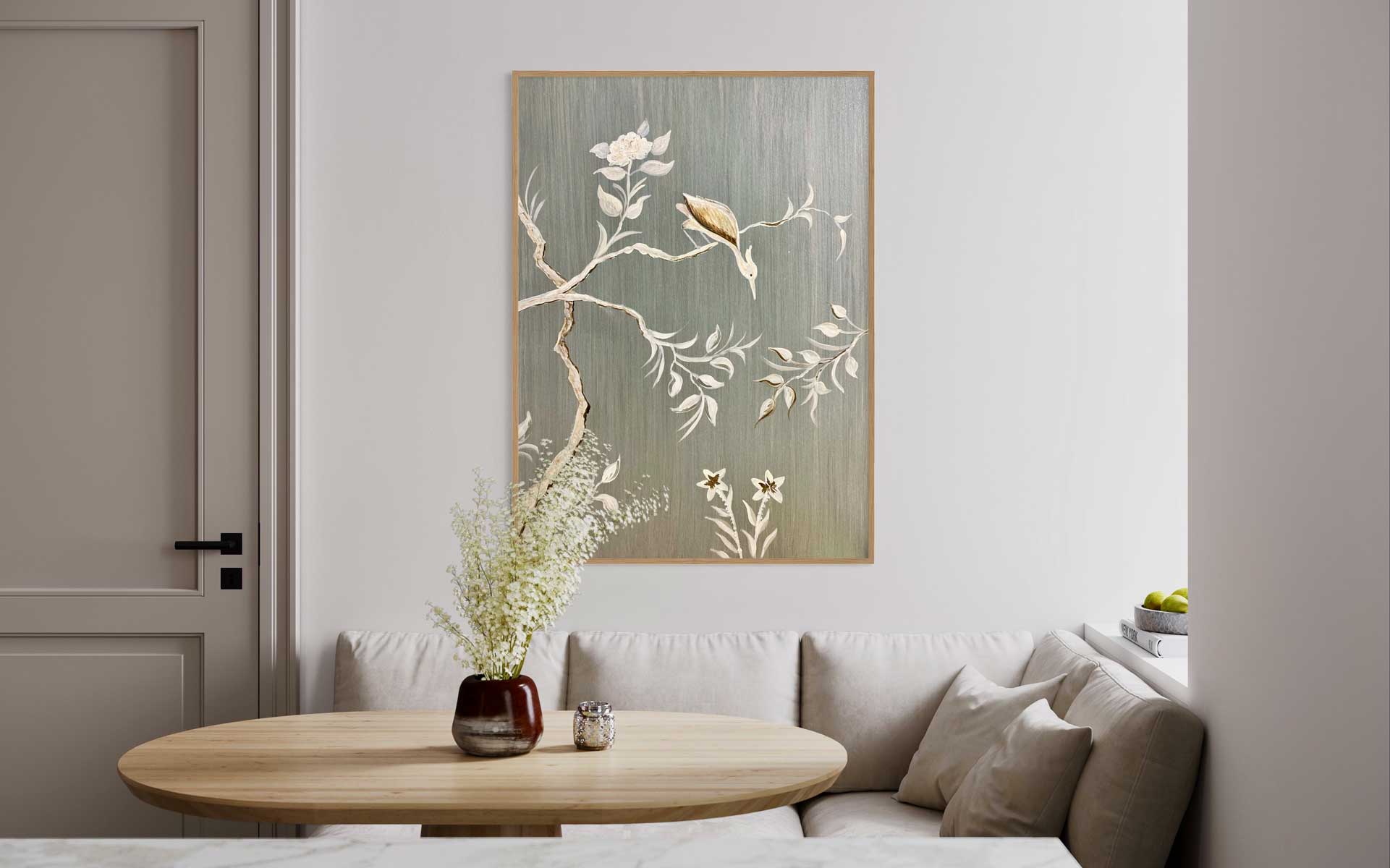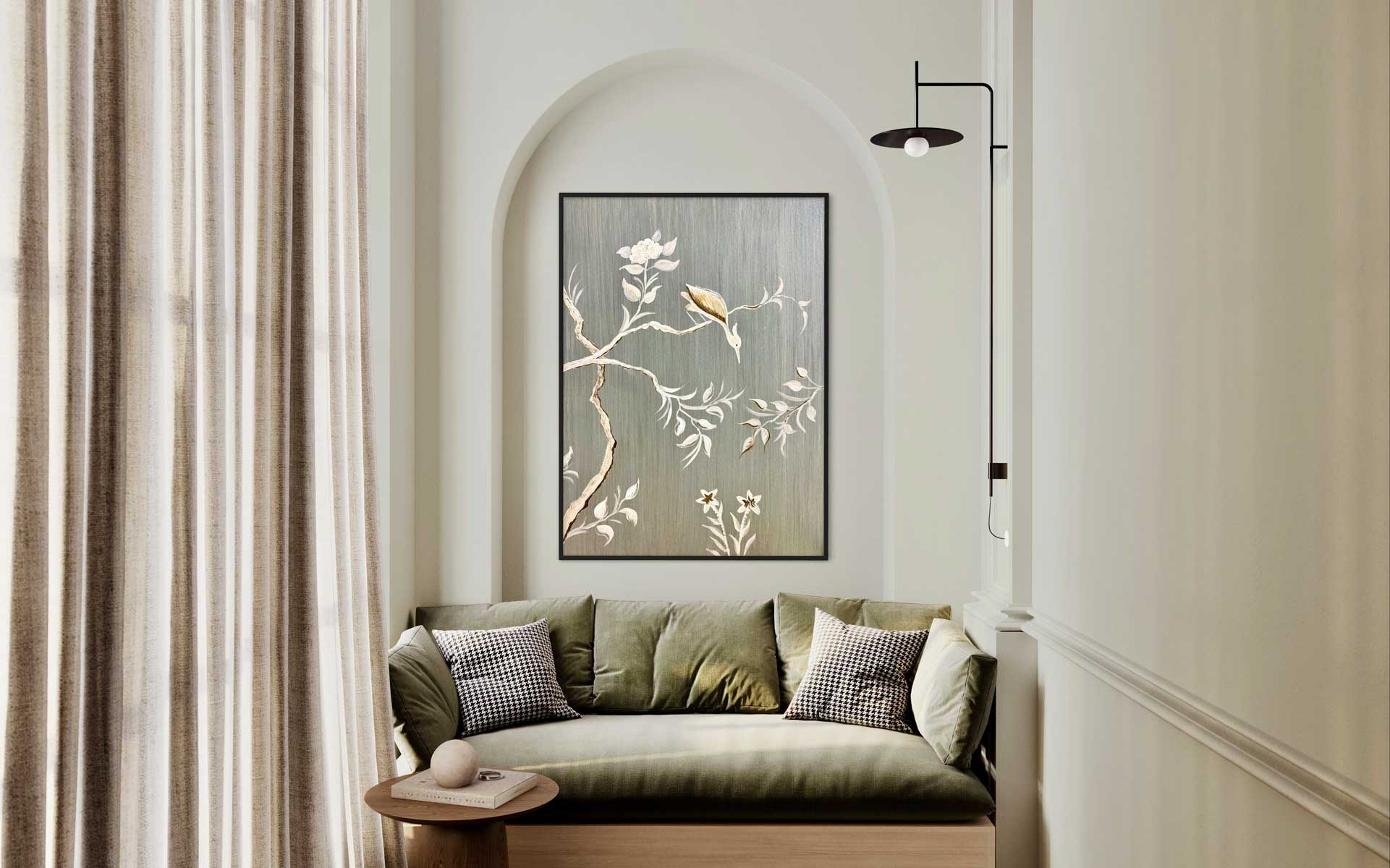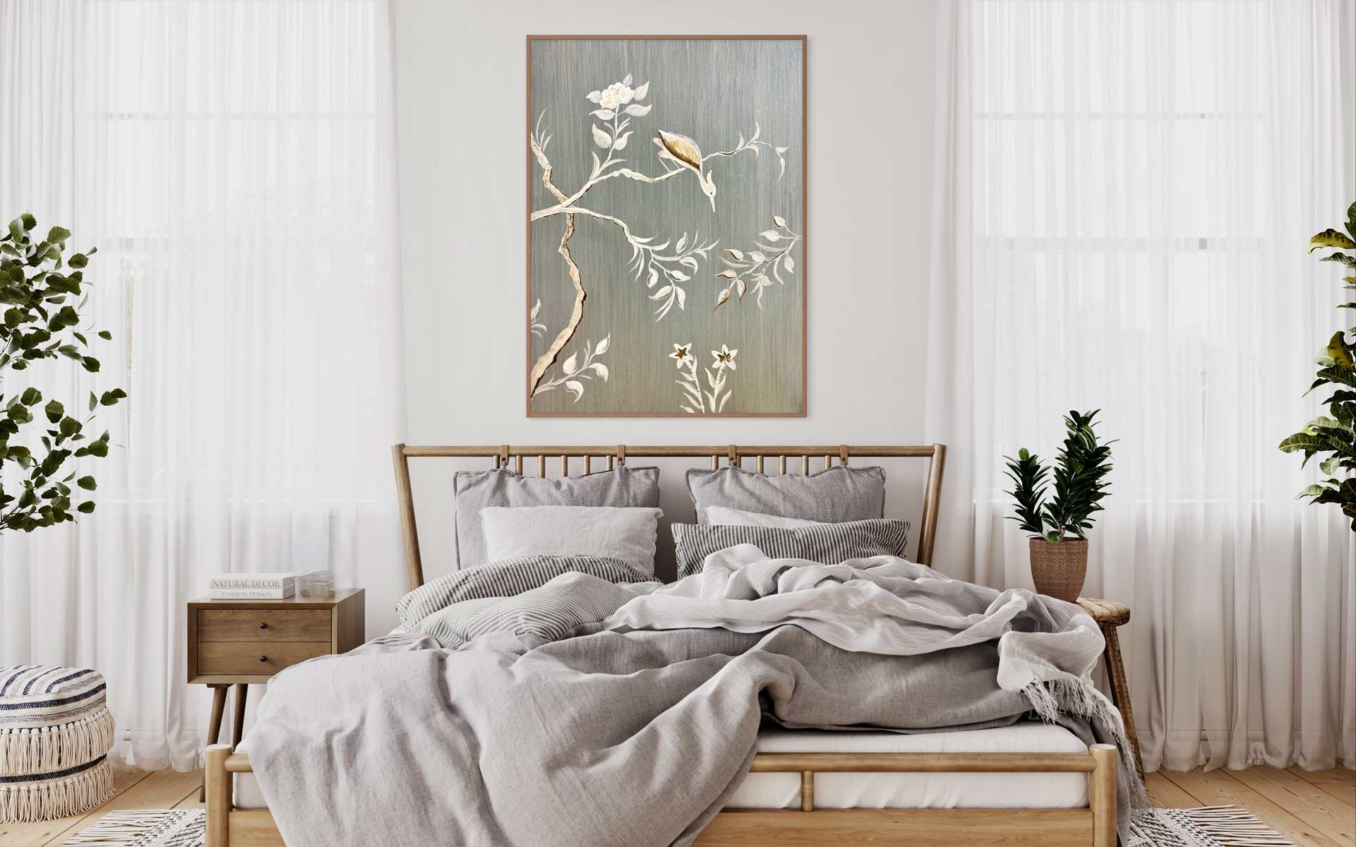 Ein zarter Kranich, dargestellt inmitten von Blumen und Zweigen: Dieses Bild mit seinem schimmernden metallischen Hintergrund vermittelt gleichzeitig ein Gefühl von Ruhe und Dynamik, Bewegung und Stille. Schon gewusst? Als einer der anmutigsten Vögel im Tierreich steht der Kranich für Glück, Gesundheit und ein langes Leben.