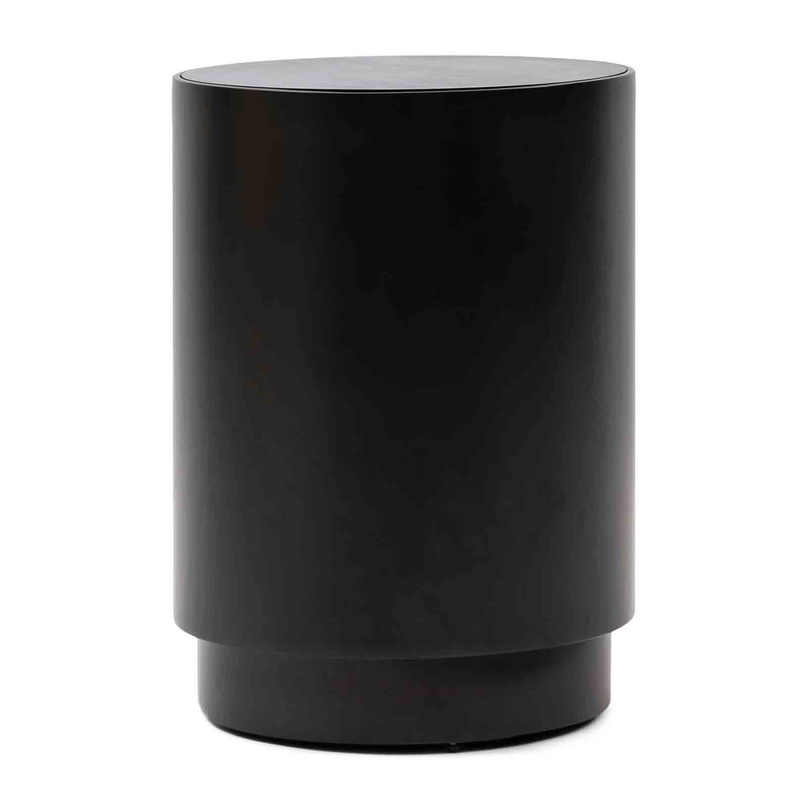 Der Beistelltisch erinnert an die Form eines Fasses und besteht größtenteils aus Metall. Der gebogene, massive Metallrahmen und der etwas schmalere Fuß verleihen ihm Stabilität, während die Tischplatte eine dunkel gebeizte Einlage aus Mangoholz enthält.