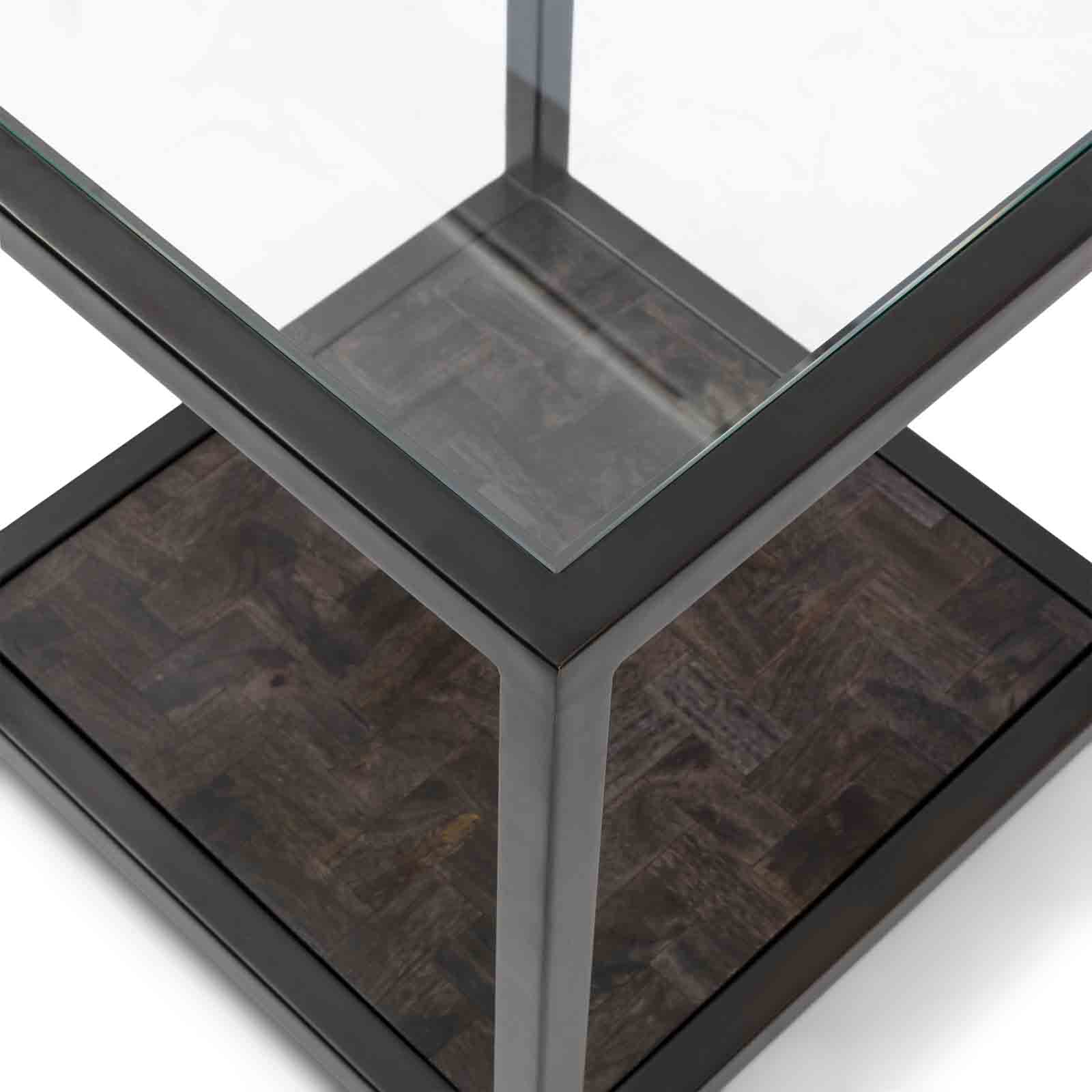 Der handgemachte Tisch Roger besticht durch schlichte Eleganz und bietet eine größere Fläche mit zwei Platten. Die Oberseite besteht aus robustem Sicherheitsglas, während die Unterseite aus warmem, grauem Mangoholz in einem schwarzen Metallrahmen eingefasst ist.