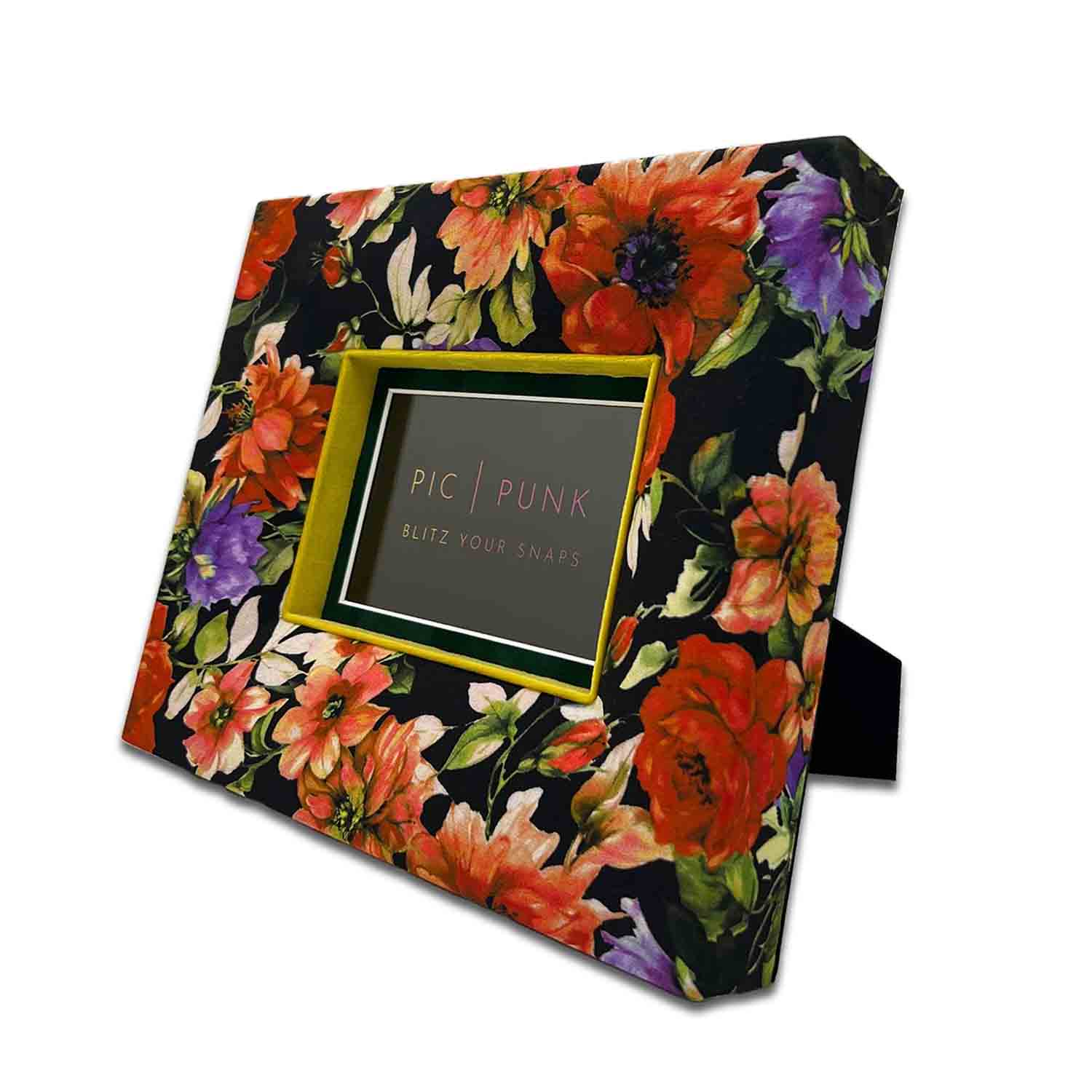 Ein Kunstwerk für sich – der Rosy Radiance Bilderrahmen vereint dramatische Tiefe mit floraler Lebendigkeit. Die schwarze Grundfarbe schafft eine edle Basis, während leuchtende orange- und lilafarbene Blüten dem Design eine verspielte, doch elegante Dynamik verleihen. Das gelbe Passepartout setzt einen frischen, leuchtenden Akzent und sorgt für eine harmonische Balance zwischen Extravaganz und Eleganz. Ein Rahmen, der Bilder nicht nur präsentiert, sondern sie stilvoll in Szene setzt.