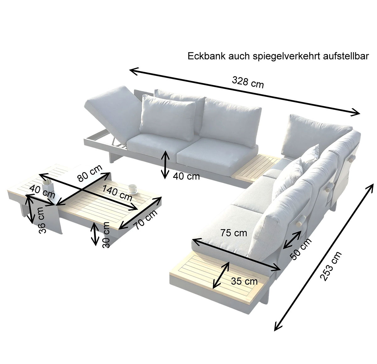 Loungegruppe1 Eckbank L 328 cm, B 253 cm, SH 40 cm, ST 75 cm1 Couchtisch L 140 cm, B 70 cm, H 30 cm1 Couchtisch Platte L 80 cm, B 40 cm, H 36 cm