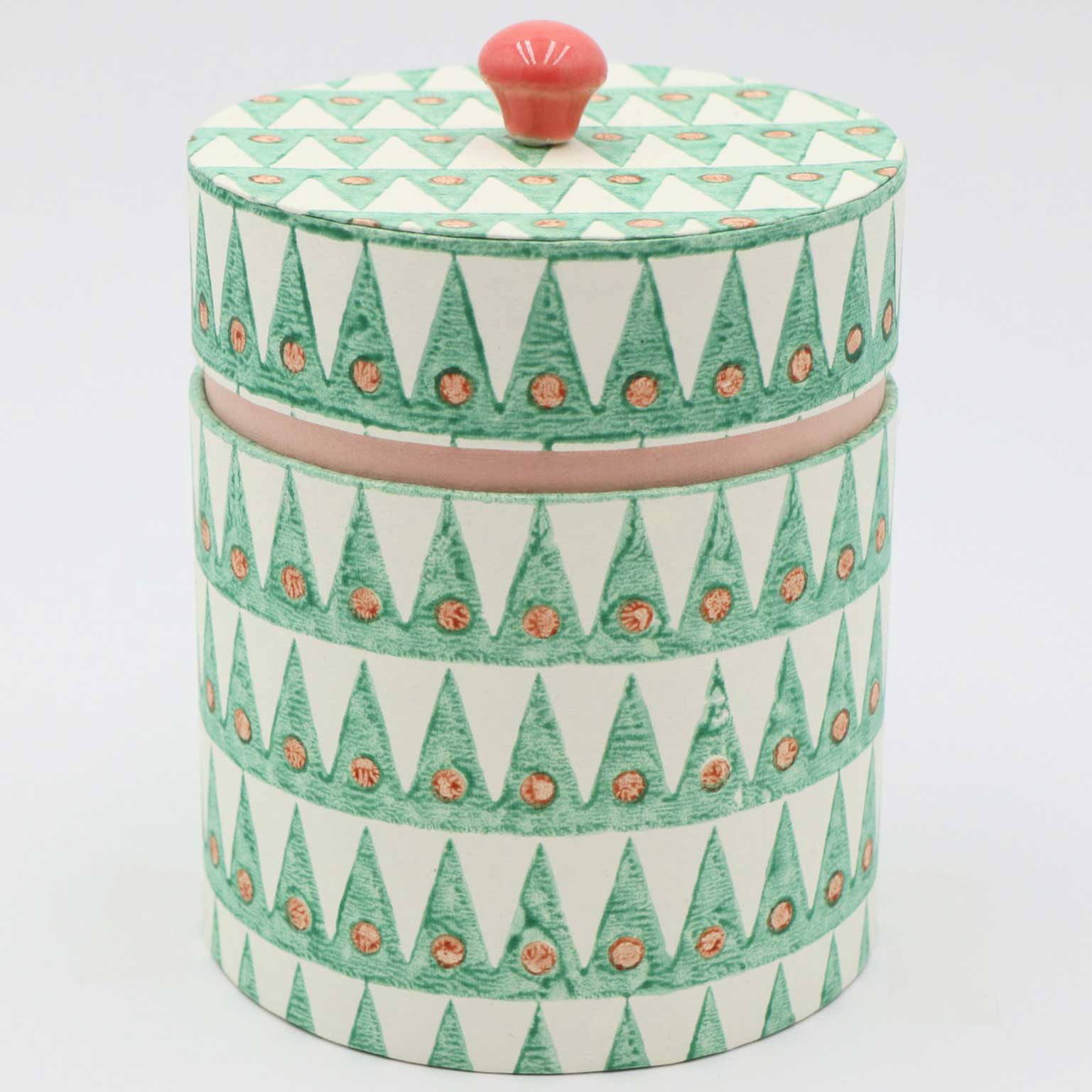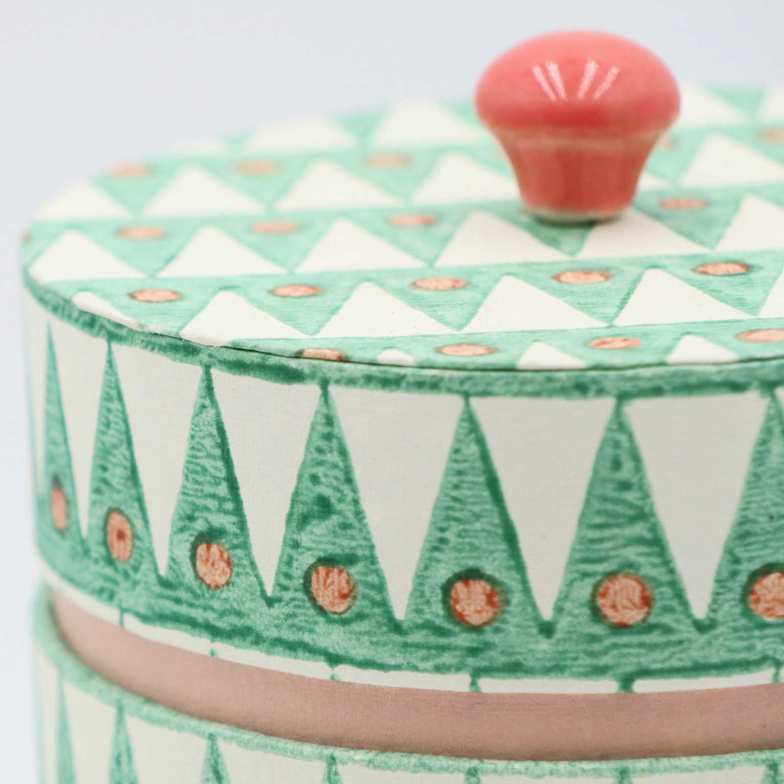 Die grüne Papierdose Zirkus besteht aus handgefertigtem Papier, aus recycelter Baumwolle handgeschöpft und mit Holzmodeln bedruckt. Die Dose ist 15 cm hoch und hat einen Durchmesser von 13 cm.