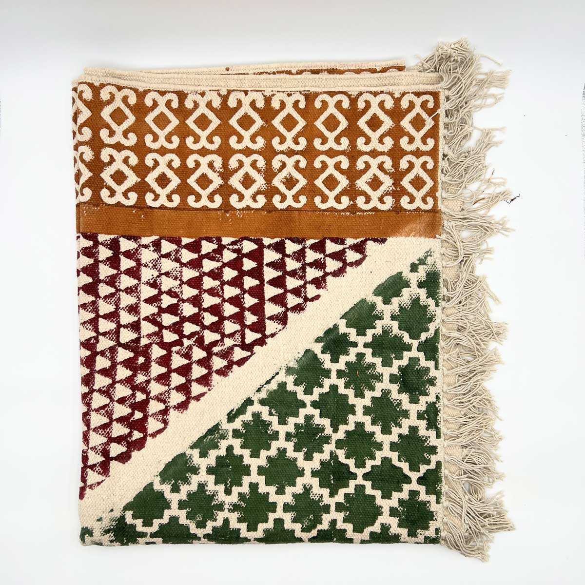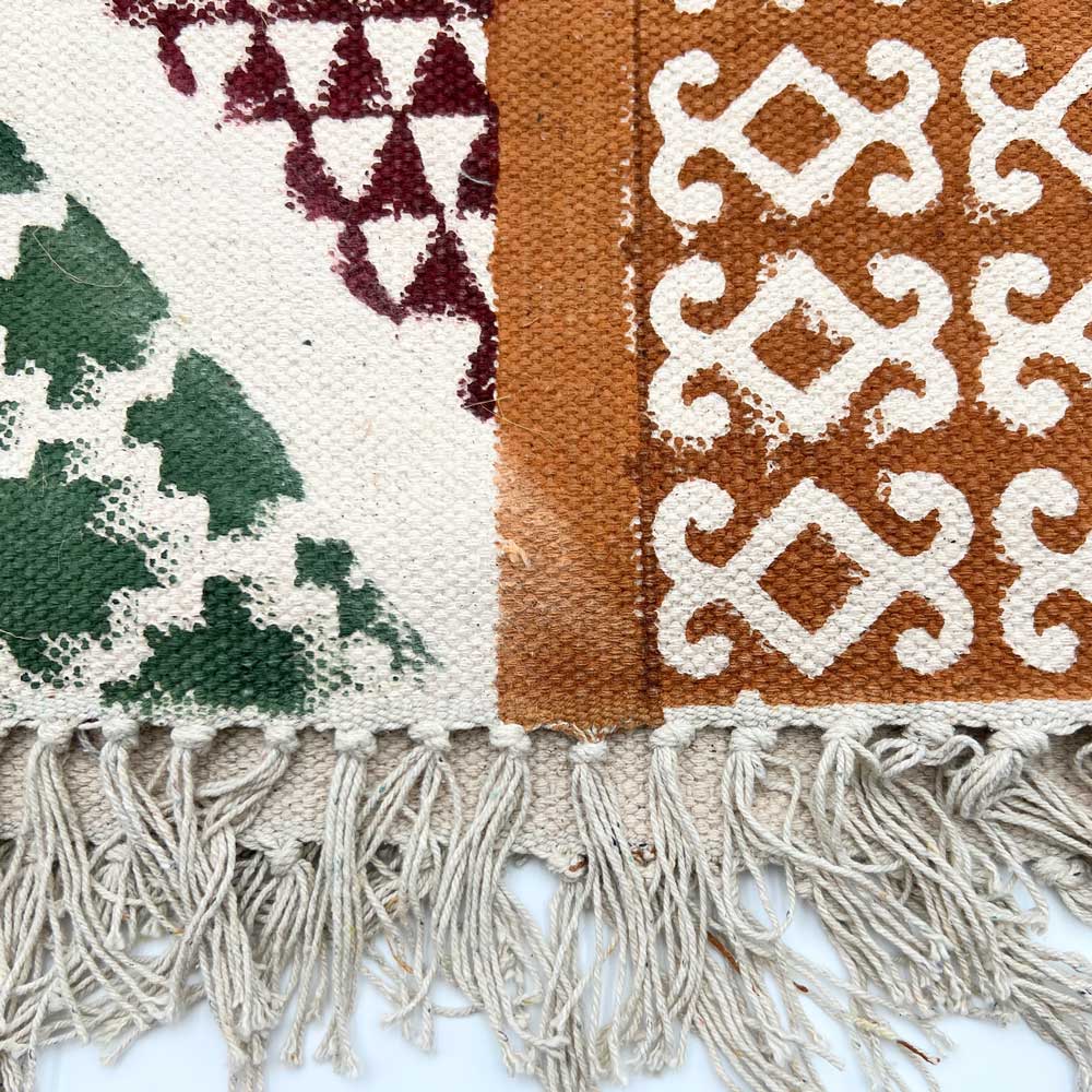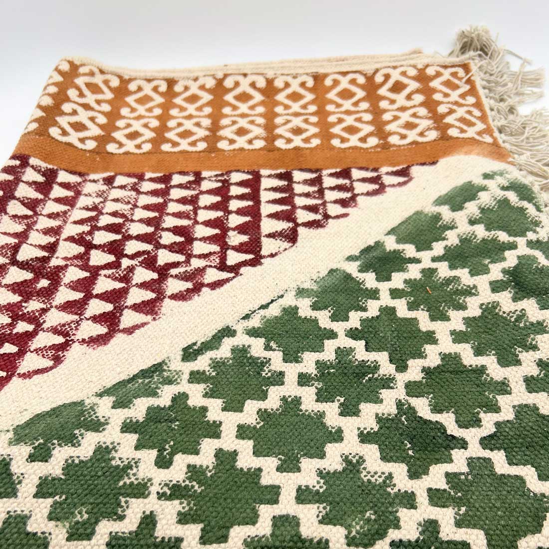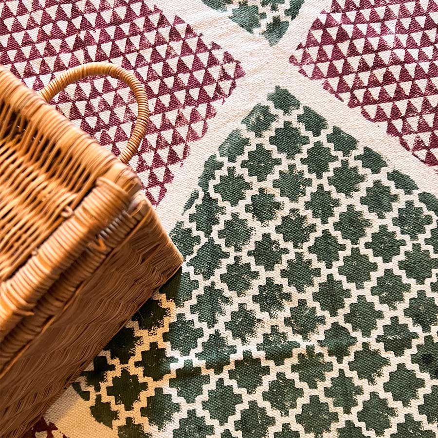 Der Teppich Diamant ist ein Unikat – bedruckt mit dem Diamant Muster in den Farben orange, rot und grün. Die kunstvolle Kombination aus traditionellem Blockdruck und natürlichen Materialien macht ihn zu einem stilvollen, einzigartigen Wohnaccessoire.