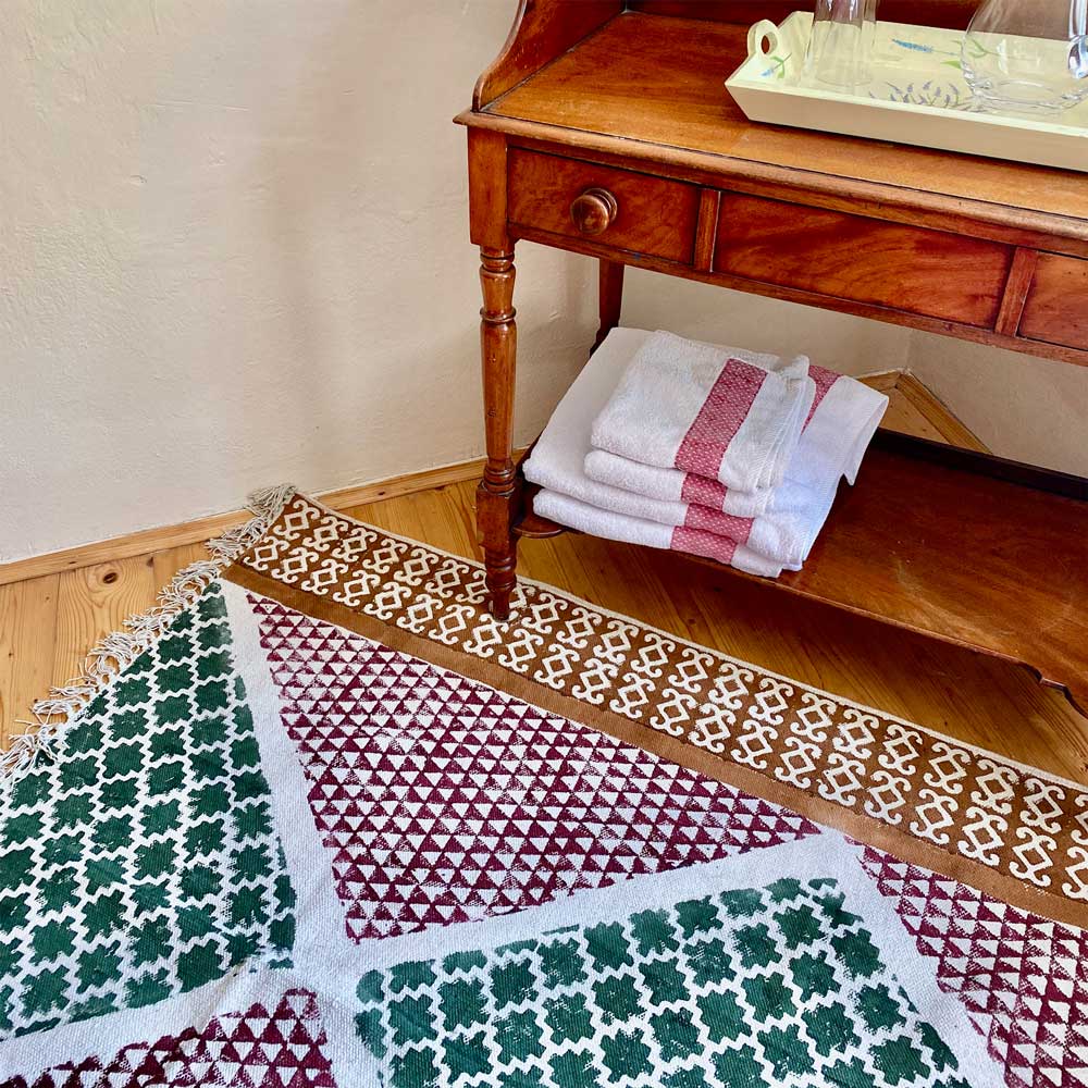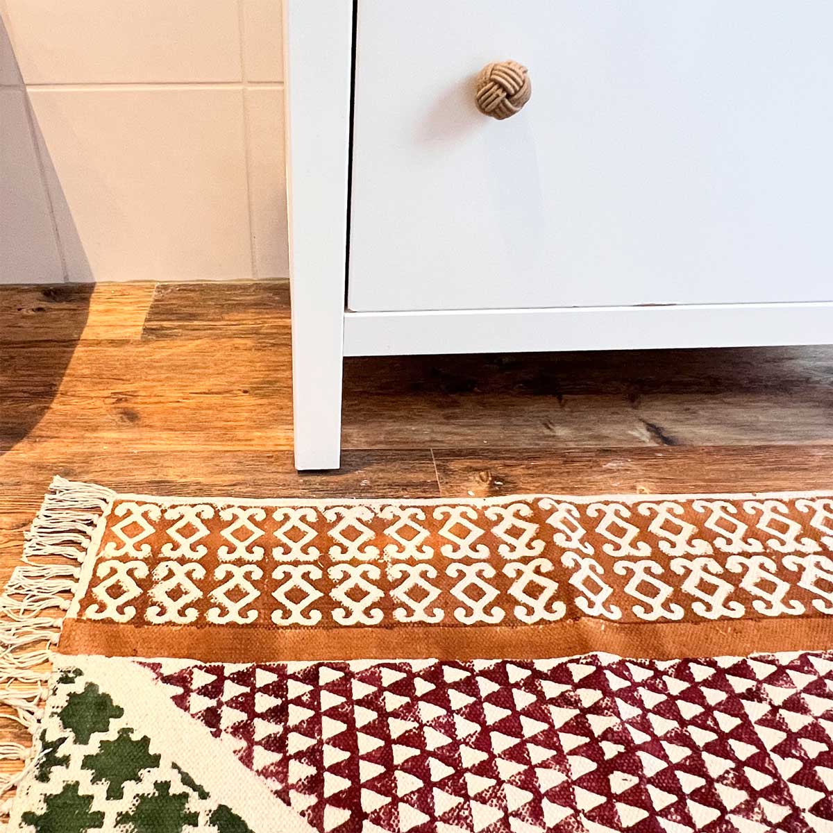 Unsere Teppiche sind aus 100 % Baumwolle handgeknüpft und anschließend handbedruckt mit Holzmodeln. So ist jeder Teppich ein Unikat und gibt Ihrem zu Hause den individuellen Touch. Die kleine Größe lässt sich sogar in der Maschine waschen.